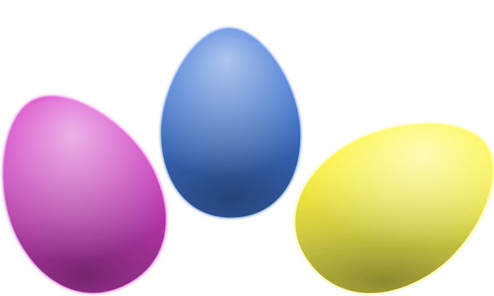 A trio of colored Easter eggs. Each egg has a highlight and shadow that you can move around in Inkscape if you rotate the egg--just double click to edit the group inside the clipping mask.