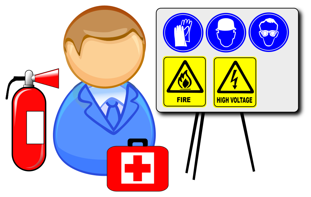 Simplified icon of occupational safety and health instructor (OSH) with first aid kit, fire extinguisher and whiteboard with safety/warning symbols.