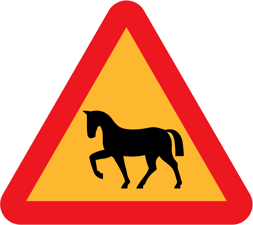 A sign warning of horses. Swedish Road Signs Collection on Wikicommons - URL http://commons.wikimedia.org/wiki/Category:Road_signs_of_Sweden information about why this image is in the public domain can be found there.