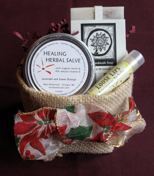 Gift basket with herbal salve, soap and lip balm created for local holiday fair